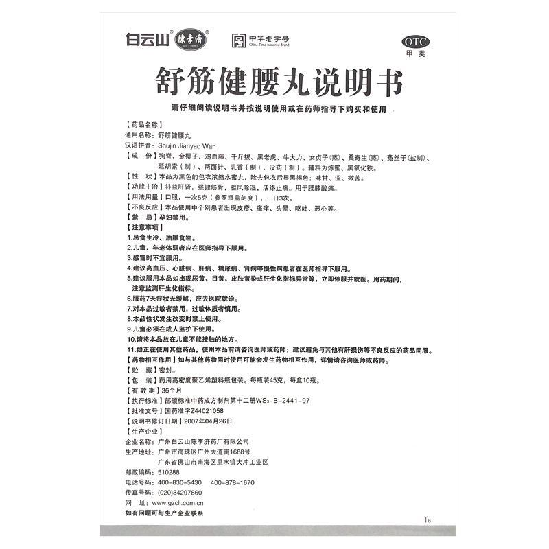 请仔细阅读舒筋健腰丸的作用说明,并在药师指导下购买和使用。 【药品名称】 通用名称:舒筋健腰丸 汉语拼音:Shujin Jianyao Wan 【成 份】 狗脊、金樱子、鸡血藤、千斤拔、黑老虎、牛大力、女