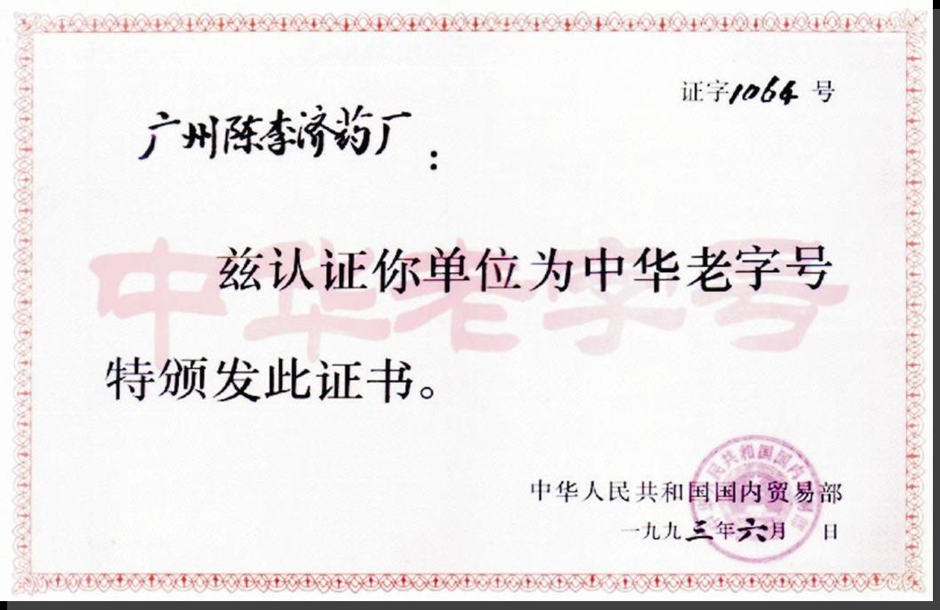 1993年,广州陈李济药厂获得中华人民共和国国内贸易部颁发的中华老字号证书。