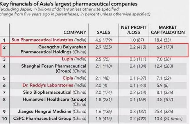 根据海外网的消息,日媒近日发布了一份“亚洲医药公司销售榜”,中国有6家医药企业进入前十名。其中广药白云山高居国内医药企业榜首,其他五家药企依次为:复星医药、中国生物制药、人福医药集团、江苏恒瑞与石药集团。中国医药企业的销量增速高于上榜的印度企业,其中广药白云山在过去五年中销售额增长了两倍甚至三倍。