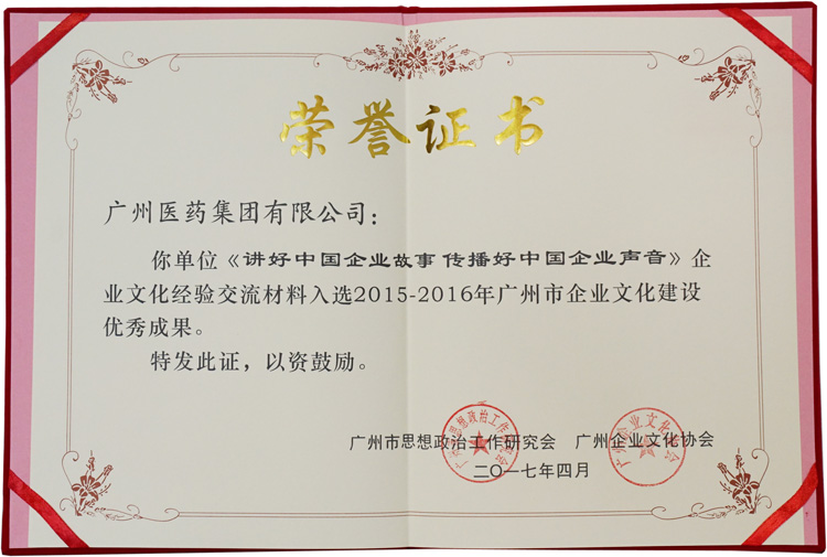 广药集团《讲好中国企业故事,传播好中国企业声音》获得广州市企业文化建设优秀成果奖,属下企业广州白云山中一药业有限公司、白云山何济公制药厂同入选广州企业文化建设创新项目名单。